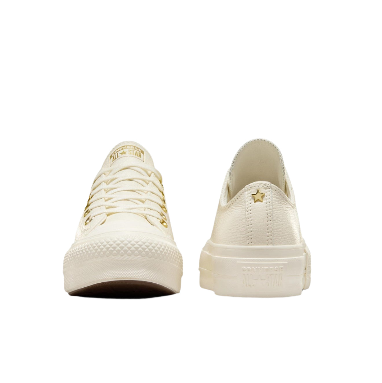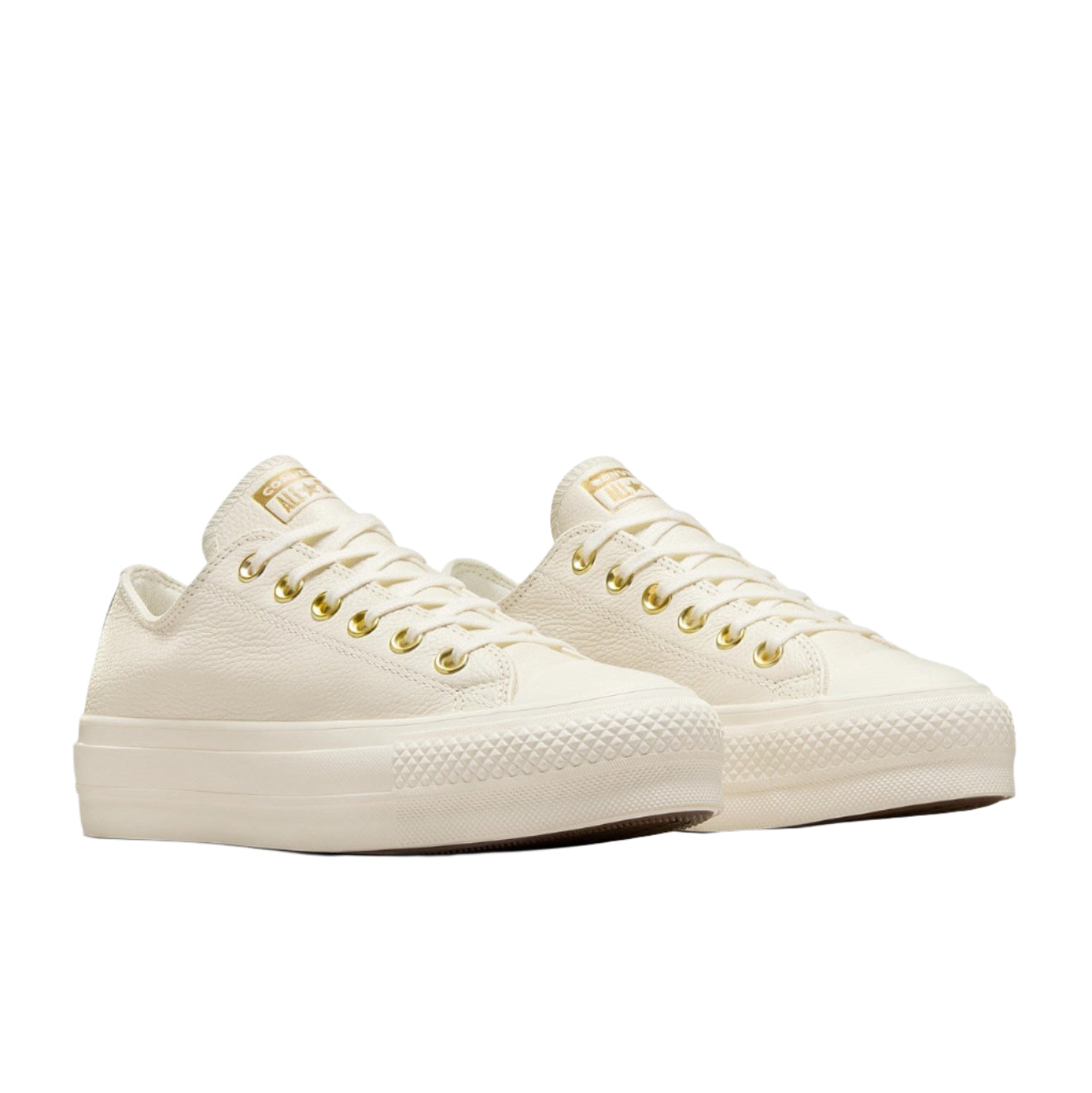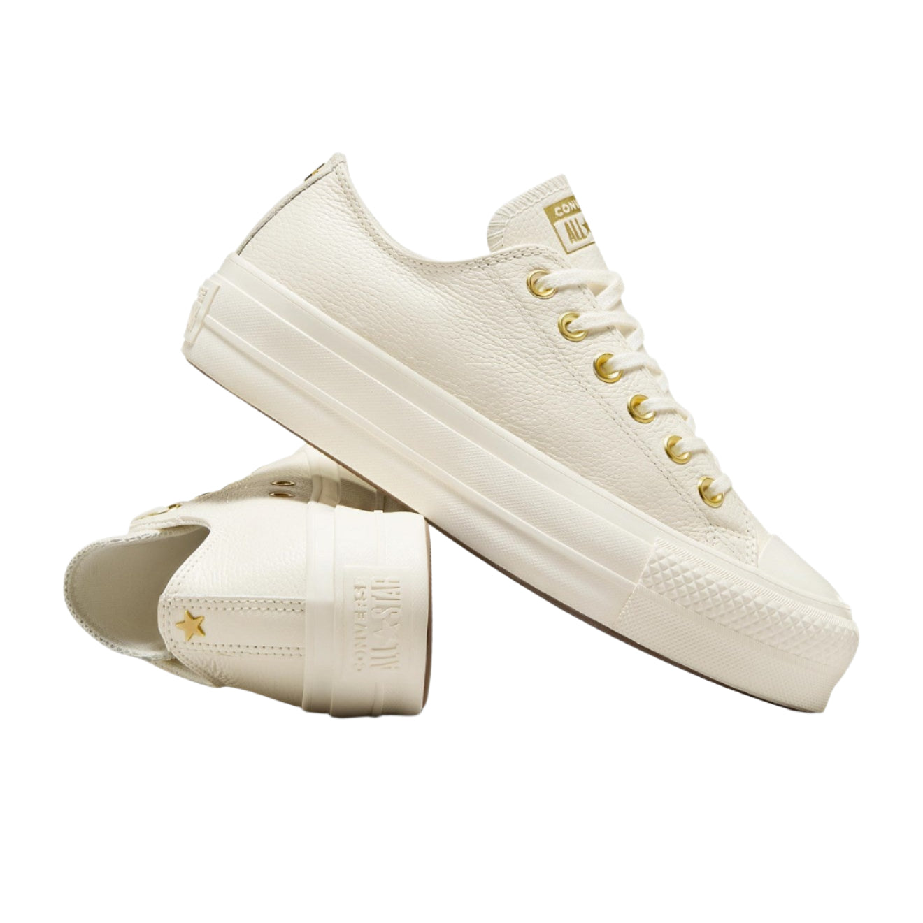 Elevate your style with the CONVERSE Chuck Taylor All Star Lift Womens Leather Low Shoe. Featuring a sleek leather design in elegant Egret and Gold, these shoes provide both comfort and style. Walk tall with the added lift and stand out with every step.