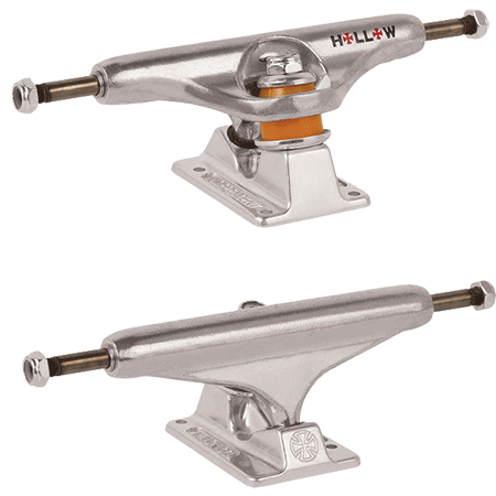Independent 129 Stage 11 Hollow skate trucks are designed with Independent’s outstanding and precise turning geometry for increased stability when landing tricks, better ‘speed-wobble’ control and decreasing the chances of ‘wheel-bite.’ This makes Independent stage 11 trucks one of the most versatile skate trucks on the market, excelling in vert and transition, street and park skating, and general cruising and carving. The ‘Hollows’ come with hollow axles and hollow kingpins for 10% lighter truck than the standard independent hangers. Forged baseplates have an aligned grain structure, offering greater strength in specific directions. This makes forged baseplates a super strong option. Forged baseplates are lighter than their cast cousins, and more slimline so you can run 7/8” bolts perfectly. The stage 11 trucks also have improved grind clearance to avoid grinding down your kingpin, as well as an improved ‘Yoke’ (divider round the bushing seat top and bottom) reducing hang-up potential for grinds like smiths and feebles. 4140 Chromoly steel axles (Nickel -1.55-2.0% for increasing hardness, Chromium – 0.5-0.96% for increasing hardness and elastic limits, Molybdenum – 0.25% for increasing hardness and Carbon – 4% increases strength and toughness.