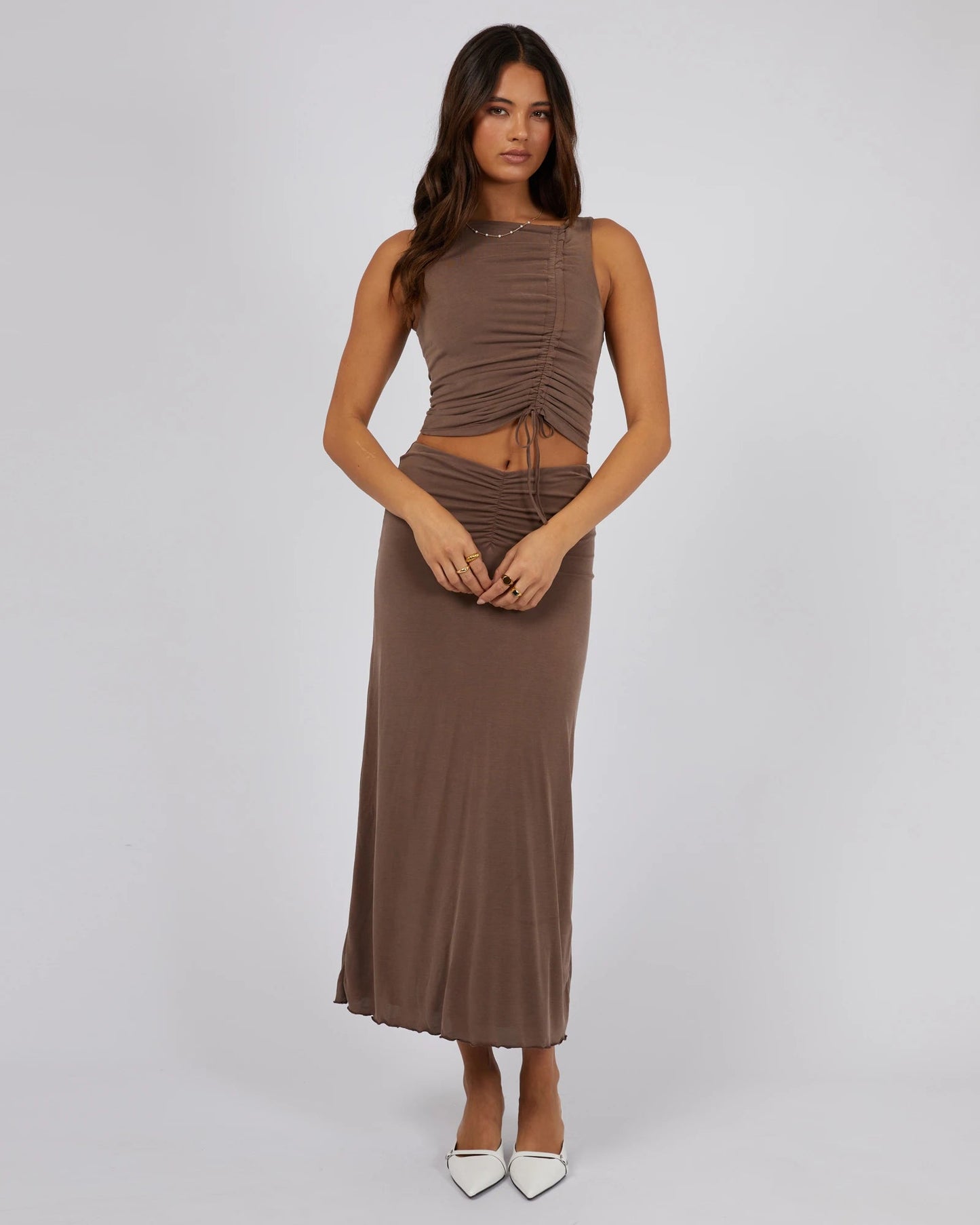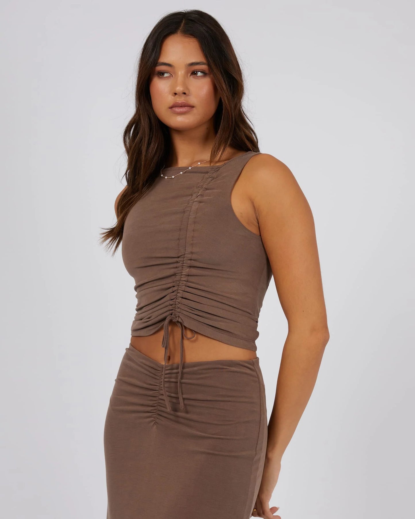 The Luxe Ruched Tank is crafted from a stretch mesh fabrication, ensuring a soft hand feel. This top features thick straps and adjustable ruched middle. Complete the look with the Luxe Maxi Skirt.