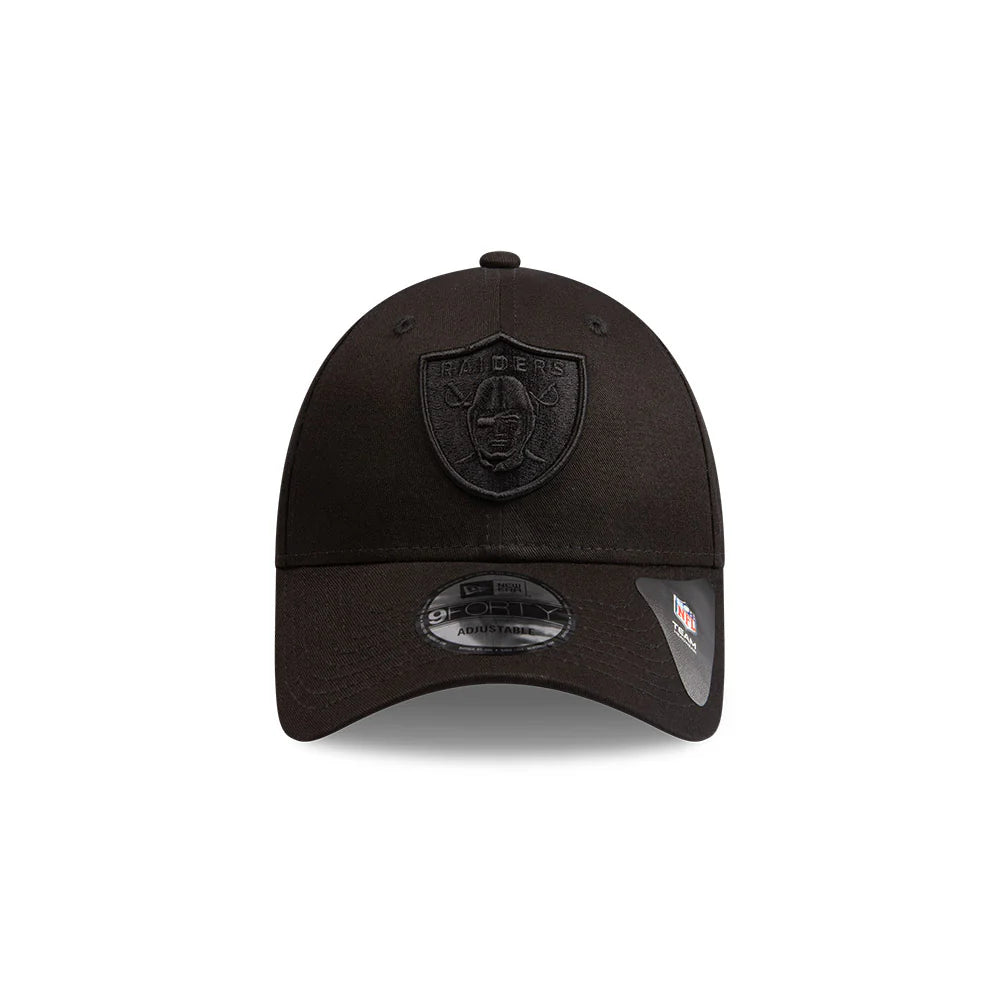 Las Vegas Raiders 9FORTY cap features a black crown with a raised Raiders logo embroidered in black on the front. The cap also has an adjustable cloth strap with metal buckle at the back.