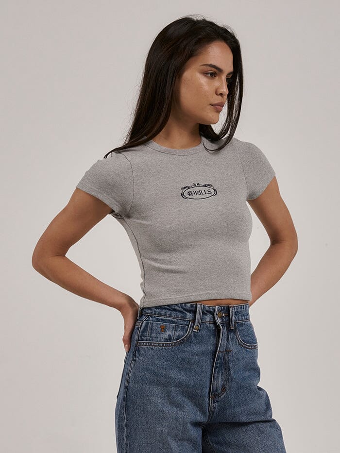 The Coat Of Thrills Y2K Tee in Grey Marle is a stylish and minimalist mini tee. With a simple design and the Thrills logo at the front, this tee exudes cool and retro vibes.