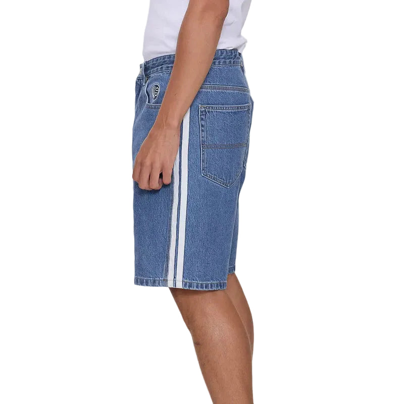- Baggy Fit Jean Short, Side Panel Stripes, Front Pocket Embroidery, Back Branded Pocket Patch