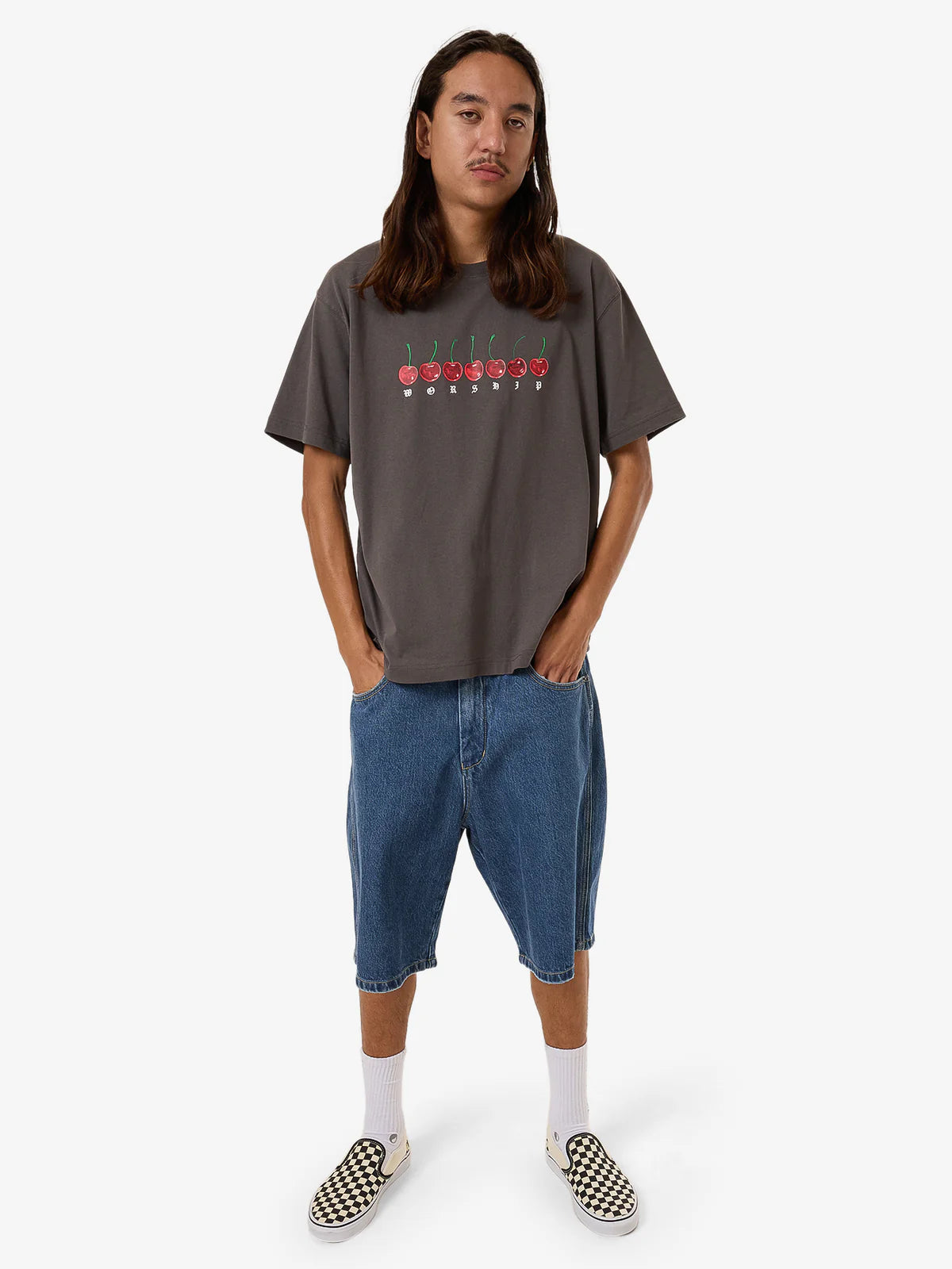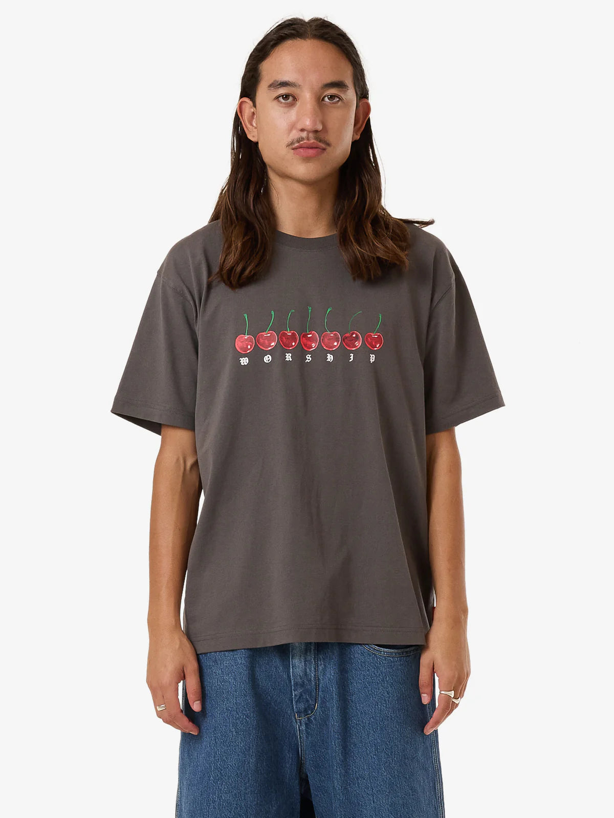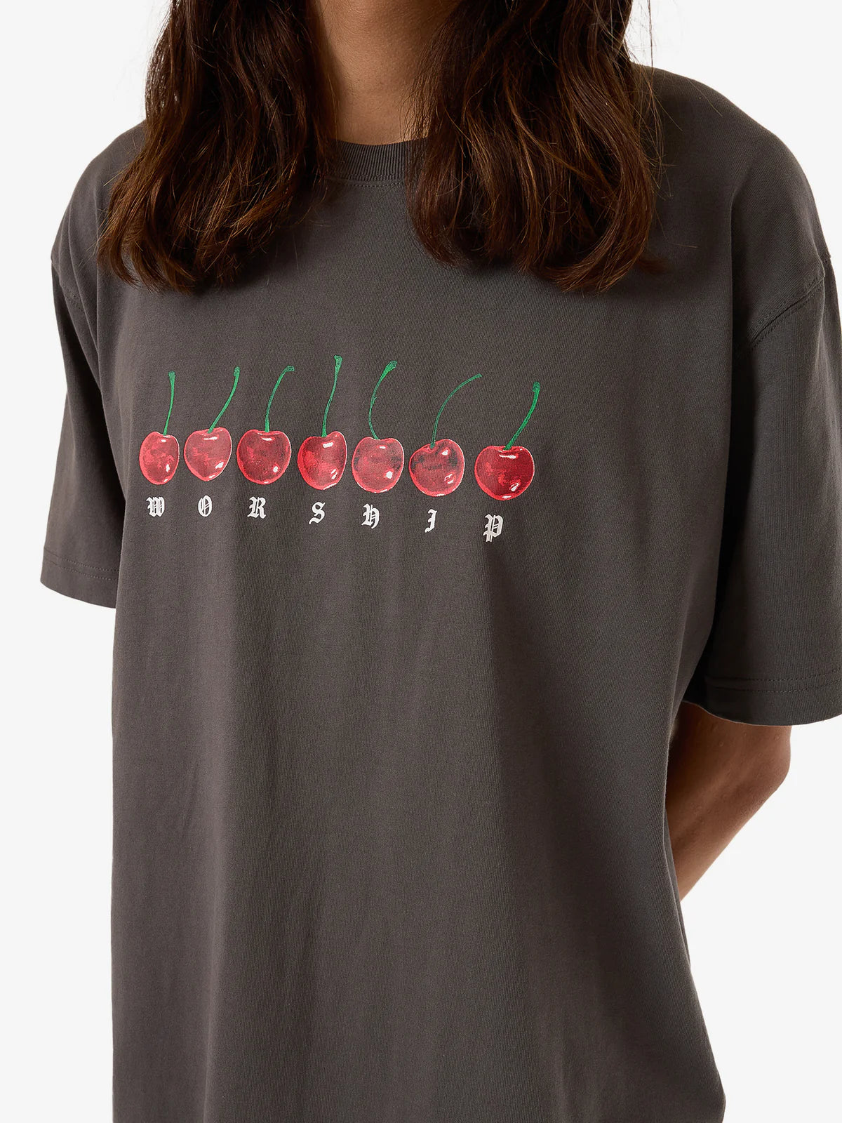 - Made for comfort and style, the Cherio Tee features a relaxed, classic silhouette in a slightly faded Worn Black colourway. It is constructed from 100% cotton jersey, a head-wearing yet soft fabrication finished with a screen-printed & embroidered cherry graphic.