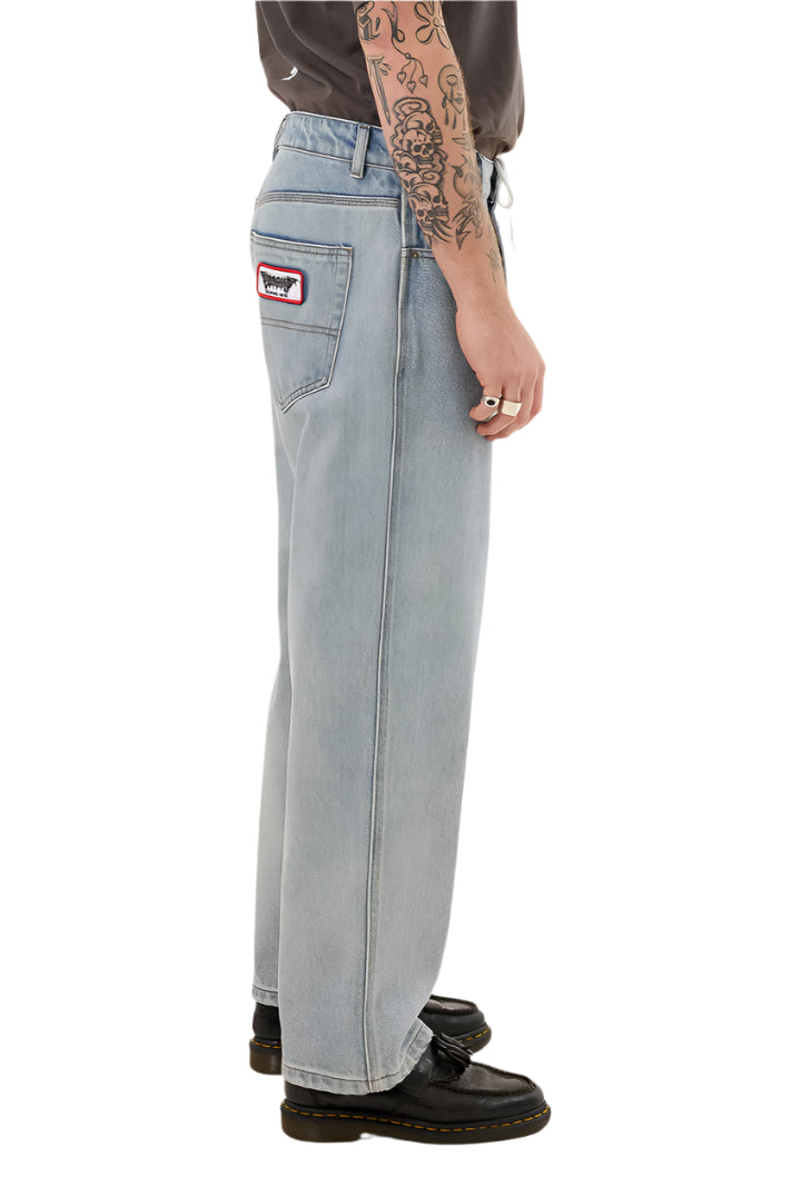 Elevate your style with WORSHIP Doom Big Lounger Mens Jean - Bull Denim Blew Dust! Made with premium bull denim, these jeans offer ultimate comfort and durability. The unique Blew Dust color adds a touch of individuality to your wardrobe. Upgrade your look and feel confident in these high-quality jeans.