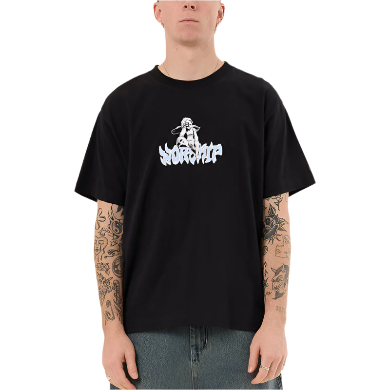 Elevate your style with the WORSHIP Mortality Mens Tee in classic black. Made with high-quality fabric, this tee offers both comfort and durability. The striking "WORSHIP" design serves as a reminder to live life to the fullest. Perfect for any occasion, show off your passion and individuality with this must-have tee.