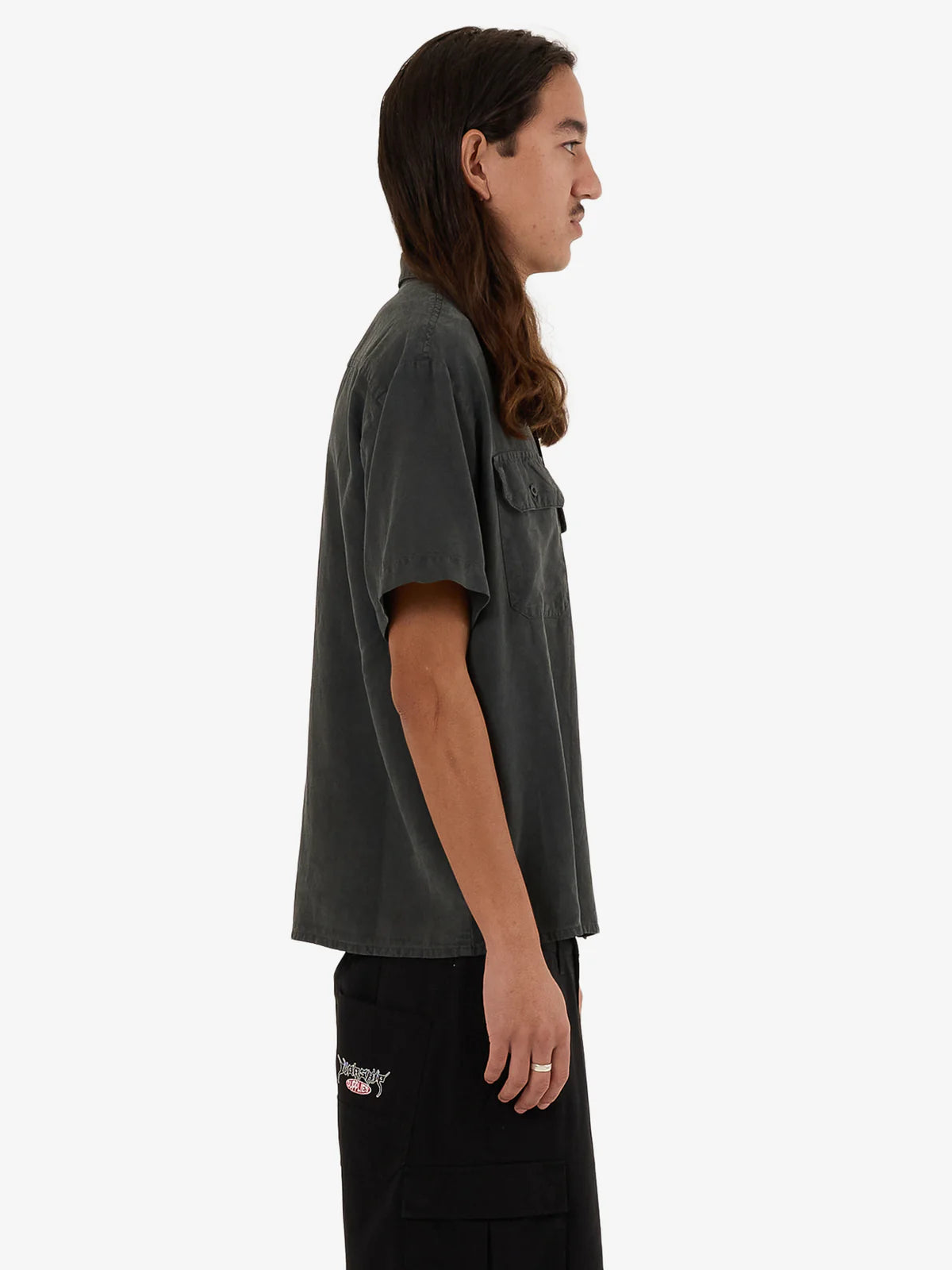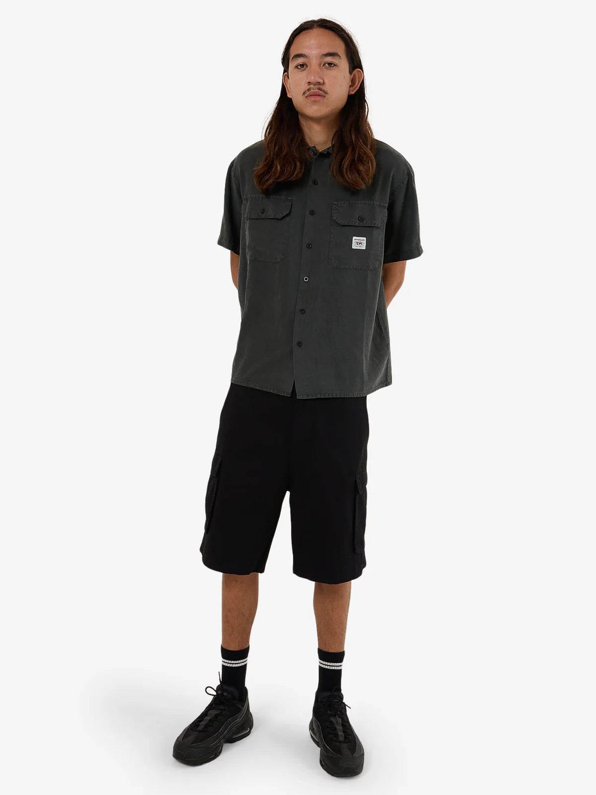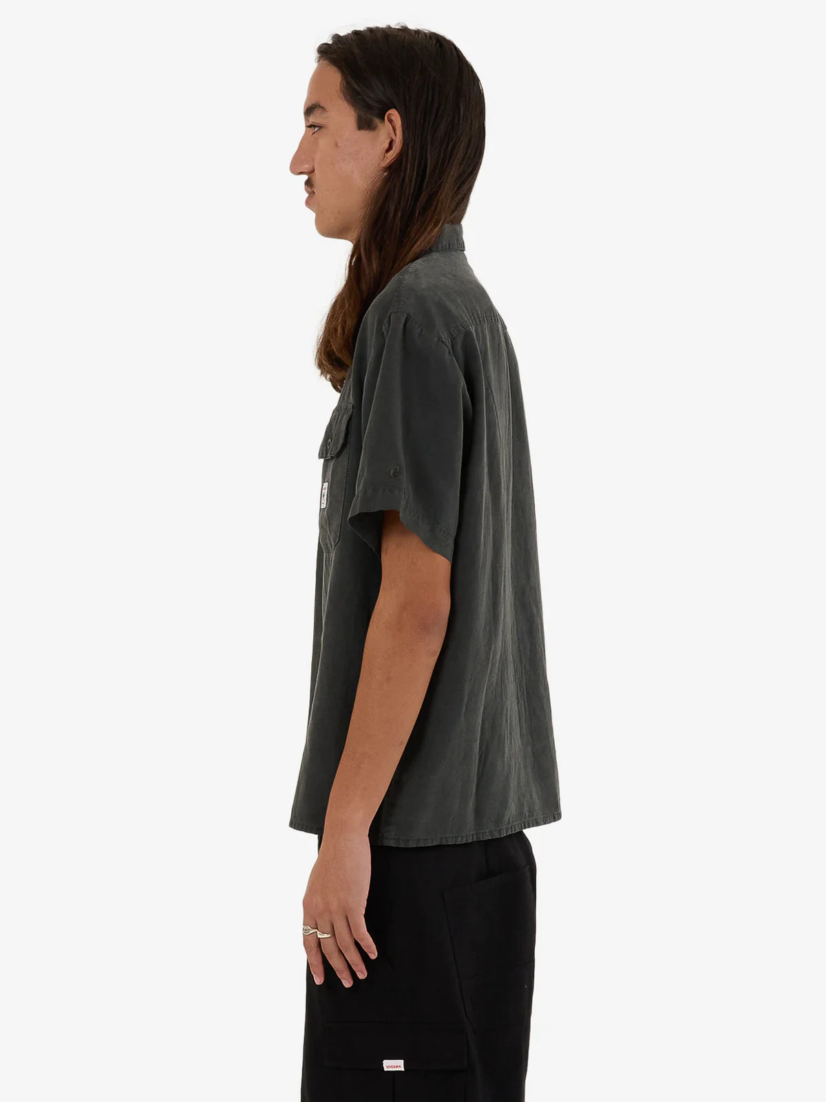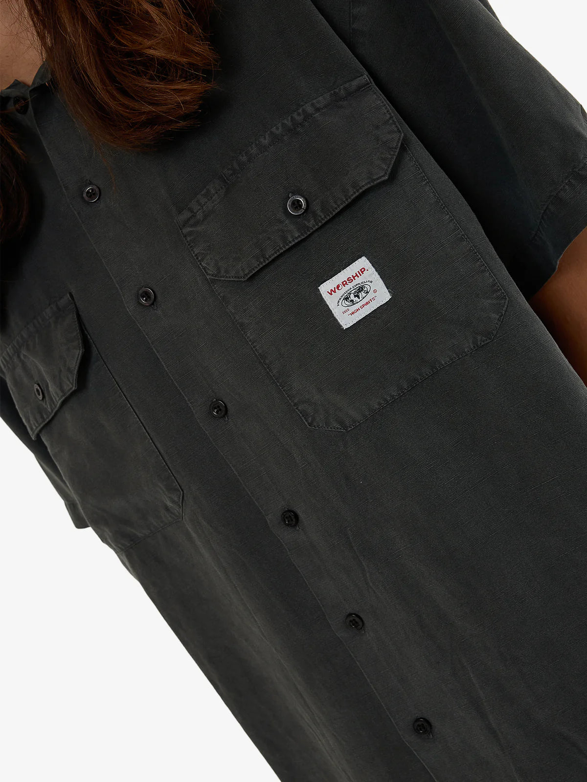 - The Service Work Shirt in Worn Black blends functionality with casual style. Made from a breathable Tencel and linen blend, this short-sleeve design features a relaxed fit, a full button-up front, dual chest pockets, and a straight hem. Finished with a subtle logo patch, it's a versatile and laidback piece for work and casual settings.