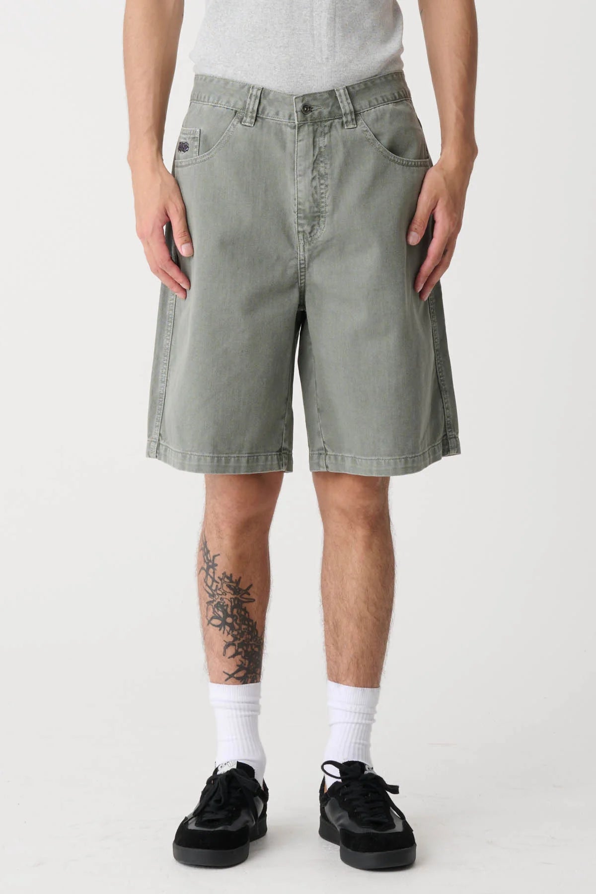 The Peace Man Bull Denim Short in Olive Grey is a fixed waist baggy fit. Features extra wide cut leg in a washed denim, they have an oversized waist with an extended rise, roomy thigh, and slightly tapered cuff.